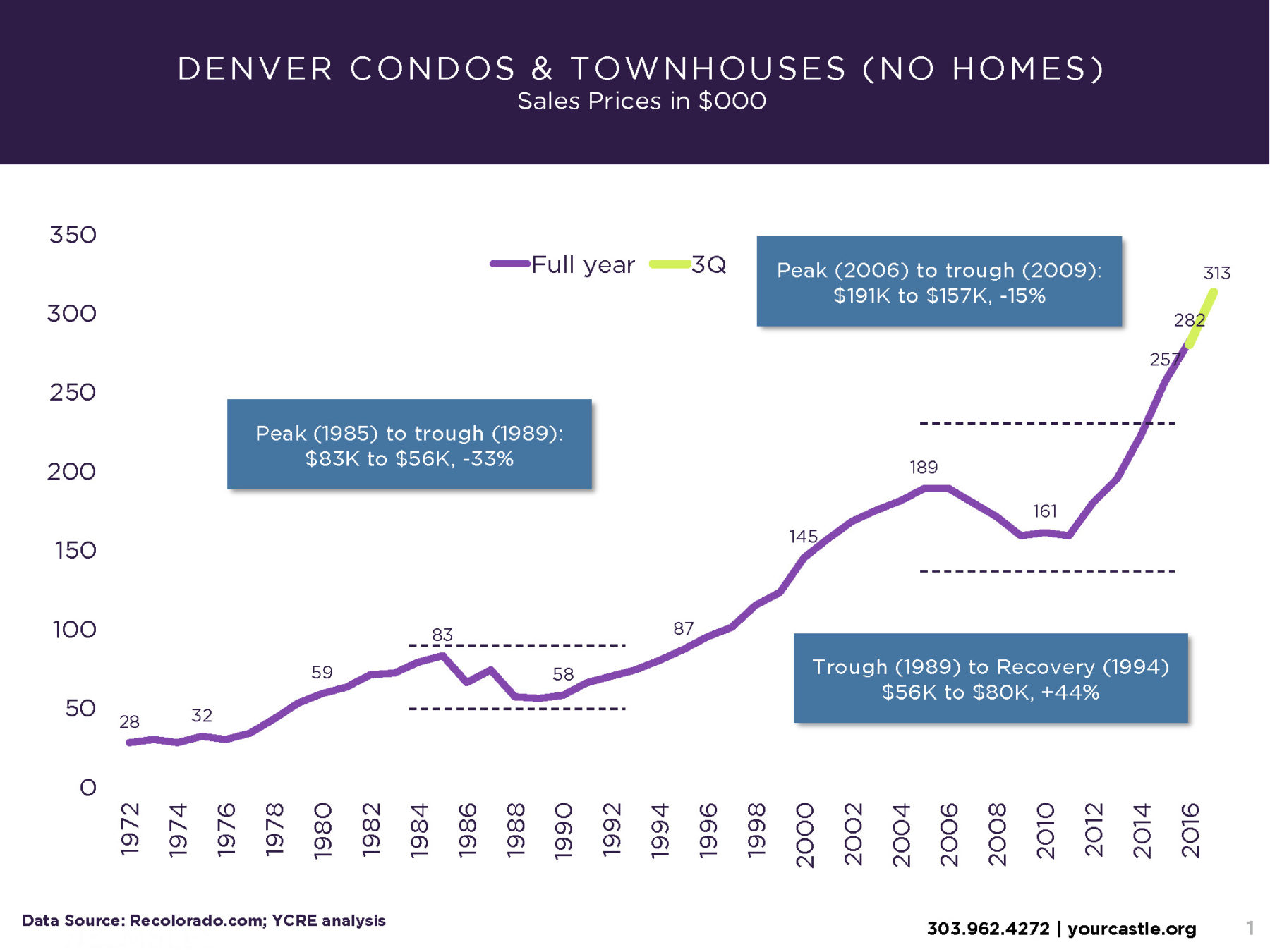 Look at the graph of metro Denver condo sales from 1972 to the present. Remarkably, the price fluctuations over this 45-year period closely mirror the rises and falls in the single-family home market. What’s more, the condo appreciation over that 45-year period is 5.6 percent per year, just 0.7% per year lower than the home market.