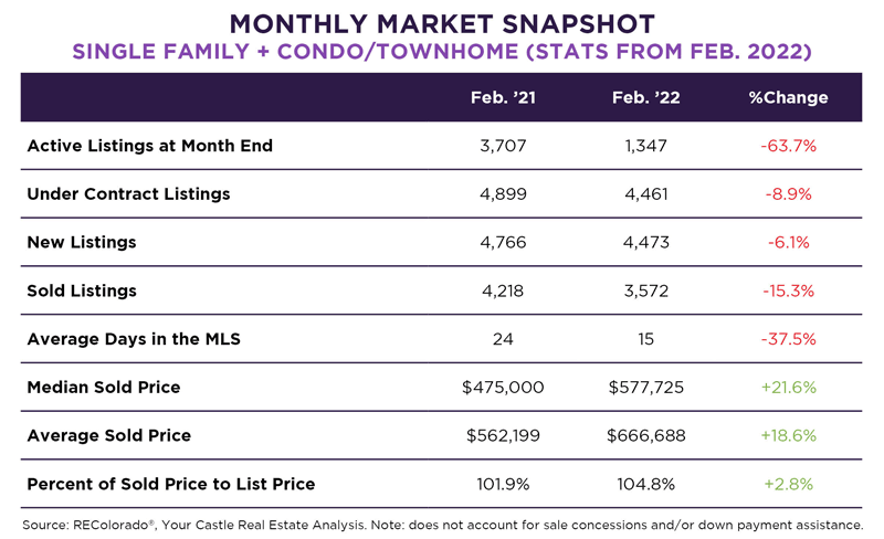 Meanwhile, back on earth, the local Metro Denver real estate market is still moving along at the same pace as it has been. Housing inventory is still extraordinarily low, and there were only around 1,200 active listings at the end of February. Average home prices are still on the rise, up about 7% from January, and up almost 17% since this time last year. That is the pattern we’ve seen lately, and with the current supply and demand imbalances in the market, these trends are expected to continue through at least the second half of the year, if not longer.