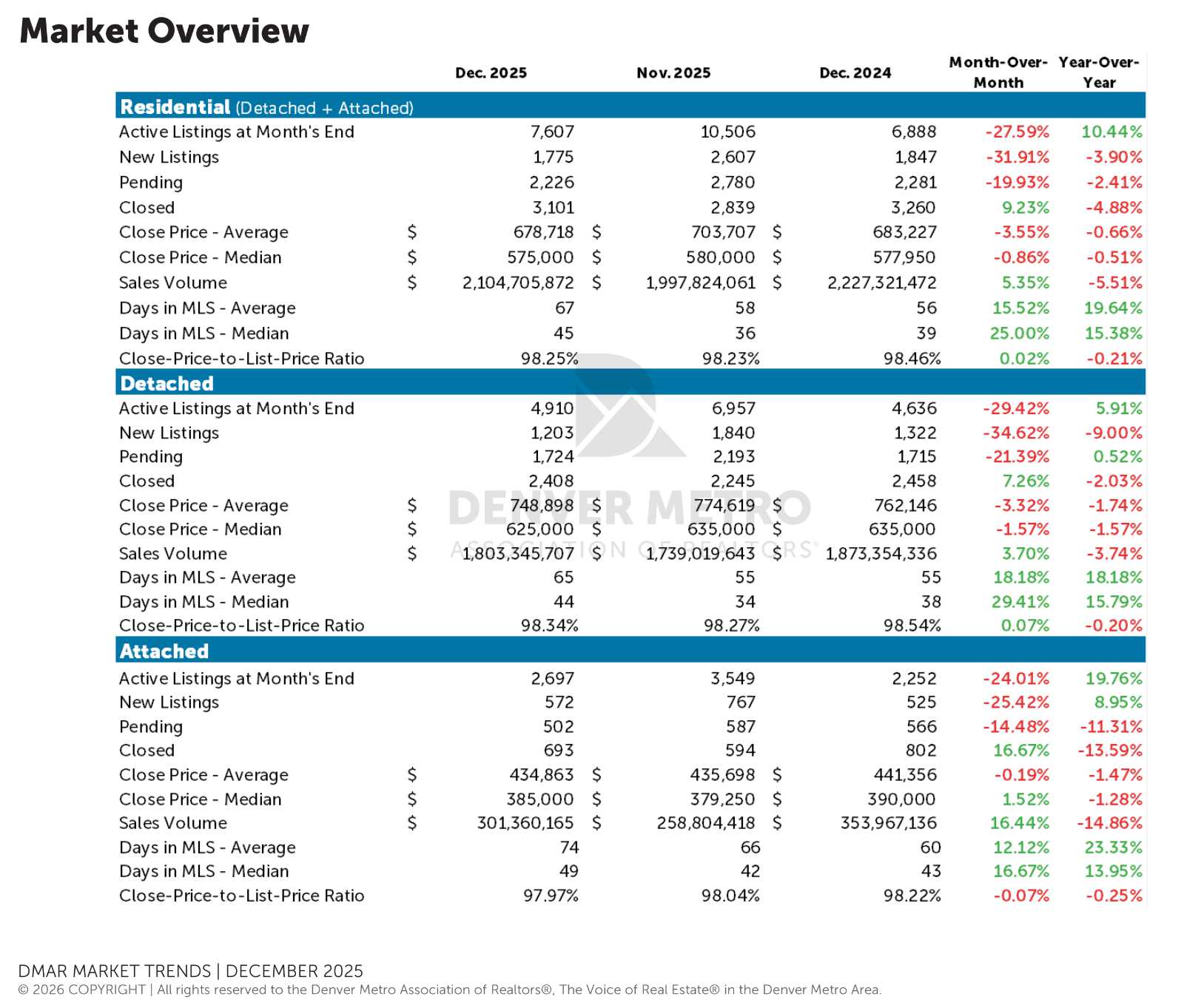 As we move into 2026, the Denver Metro housing market feels consistent. Prices have stabilized, inventory has normalized, and both buyers and sellers are operating with clearer expectations. Rates are down, momentum is building, and the market enters the new year with steadiness and direction.