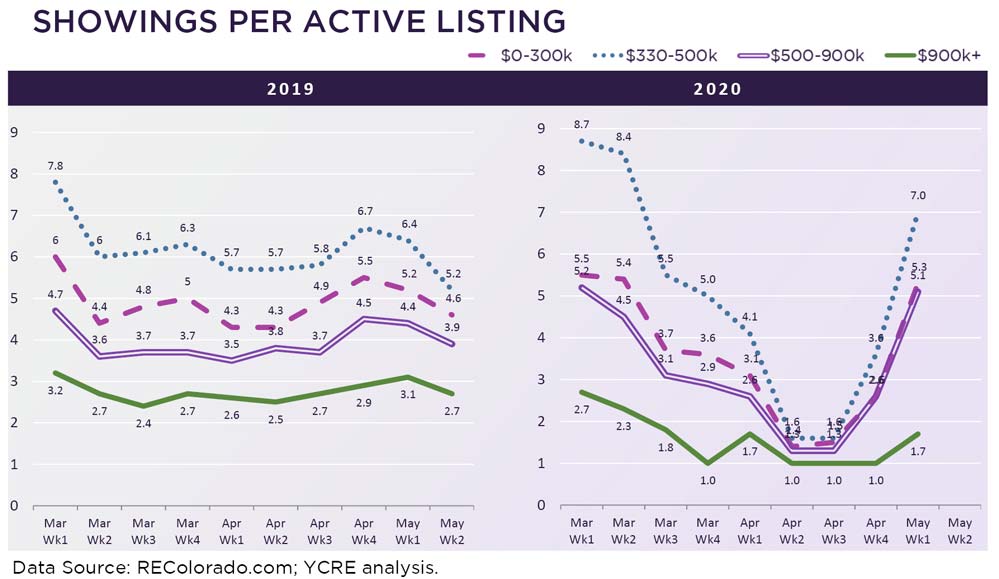 We expected showings to recover quite dramatically sometime during the Summer or early Fall due to pent up demand, but almost the moment the showing restrictions lifted, showing traffic exploded. At least in terms of local real estate, this is a strong indicator of what economists refer to as a “V” shaped recovery, where the economy dips quickly into a trough and then shoots back up nearly as fast into a recovery. You can see a strong “V” pattern emerging in the following trends graphs. Below are more details broken down by price point: