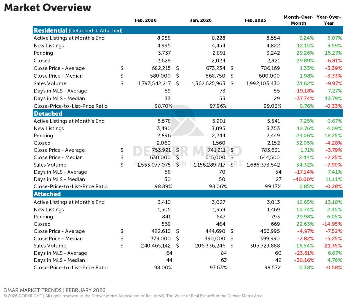 As we move into spring, the Denver Metro market appears well positioned for an active season. Inventory is improving, buyers are engaged, and pricing is aligning more closely with today’s market conditions rather than yesterday’s expectations. Sellers who enter the market prepared and priced correctly should find a receptive audience, while buyers who stay focused on their long-term goals rather than short-term rate movements may discover opportunity. A healthy balance of supply and demand may be exactly what this spring market delivers.