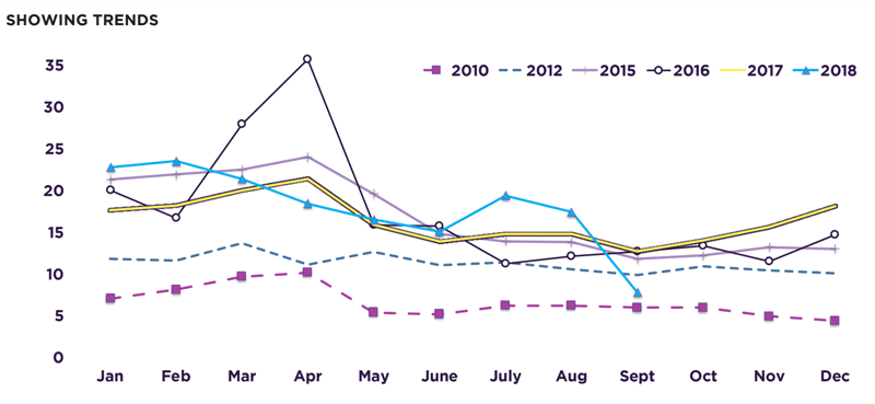 The last graphic I want to show you is a metric that Your Castle invented years ago which compares the average number of showings per listing per month. The higher this number is, the stronger the real estate market. A higher number means there are either more showings per month, fewer listings on the market, or both. The opposite is also true. A lower number means either there are fewer showings per month, more listings, or both, which translates into a weaker market. What you see in this graph is that the number of showings/listing/month plummeted in September 2018 (blue line) down to about seven, suggesting a weaker market during that month.