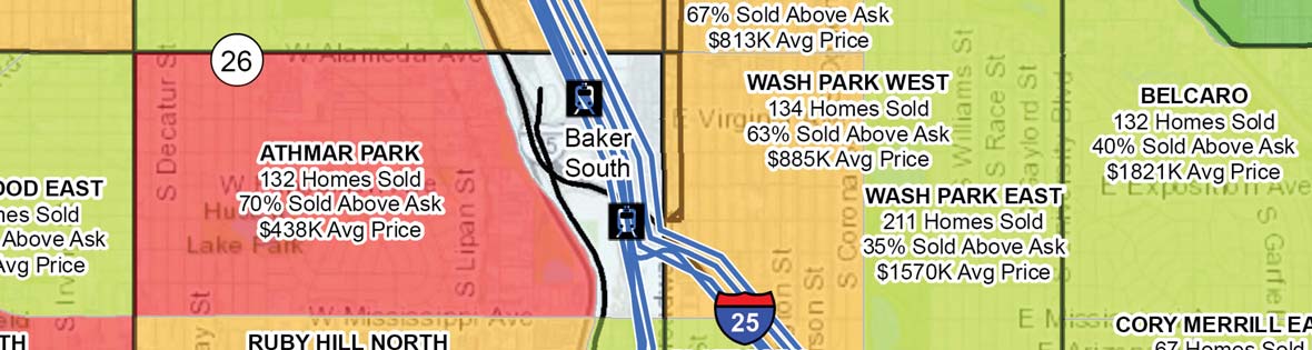 To help you see the intensity of demand for a given neighborhood, Your Castle has made a specialized map that focuses on the number of homes in a given neighborhood that sold at a premium over the past year. You can see the total number of homes that sold for over ask price, the percentage of homes that did so, and the average sales price in the area. For example, Wash Park East in the map sample had 35% of homes sell over asking price, and homes there sold for $1.57 million on average. Not too shabby! Compare those numbers to Wash Park West, where 63% of homes sold over asking price, and the average price was slightly lower at $885K. That area of the map is shaded orange to signify it had a fairly high percentage of homes selling at a premium. Now compare both of those neighborhoods to Athmar Park across I-25, where a staggering 70% of homes sold above asking price. There, the average sales price was $483K. That area of the map shaded red indicating that it was red-hot in terms of buyer demand. Homes there were selling well above asking price over the past year. These three neighborhoods are a good representation of the current macro trend in Metro Denver. Homes in luxury neighborhoods like Wash Park East had a significant number of homes sell for over asking price, but lower-priced areas brought far greater premiums. This is in large part due to a lack of entry-level homes for sale and intense demand.